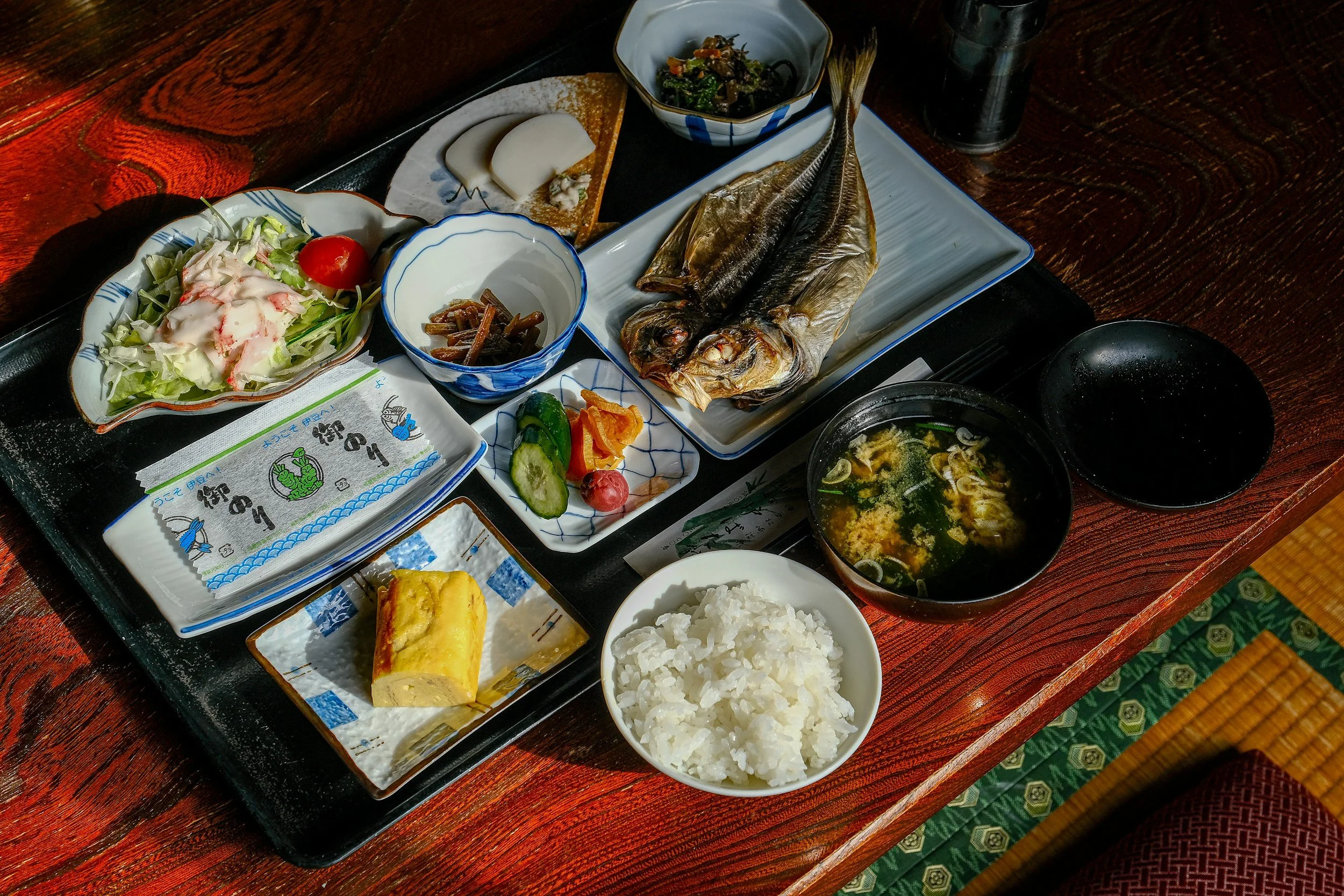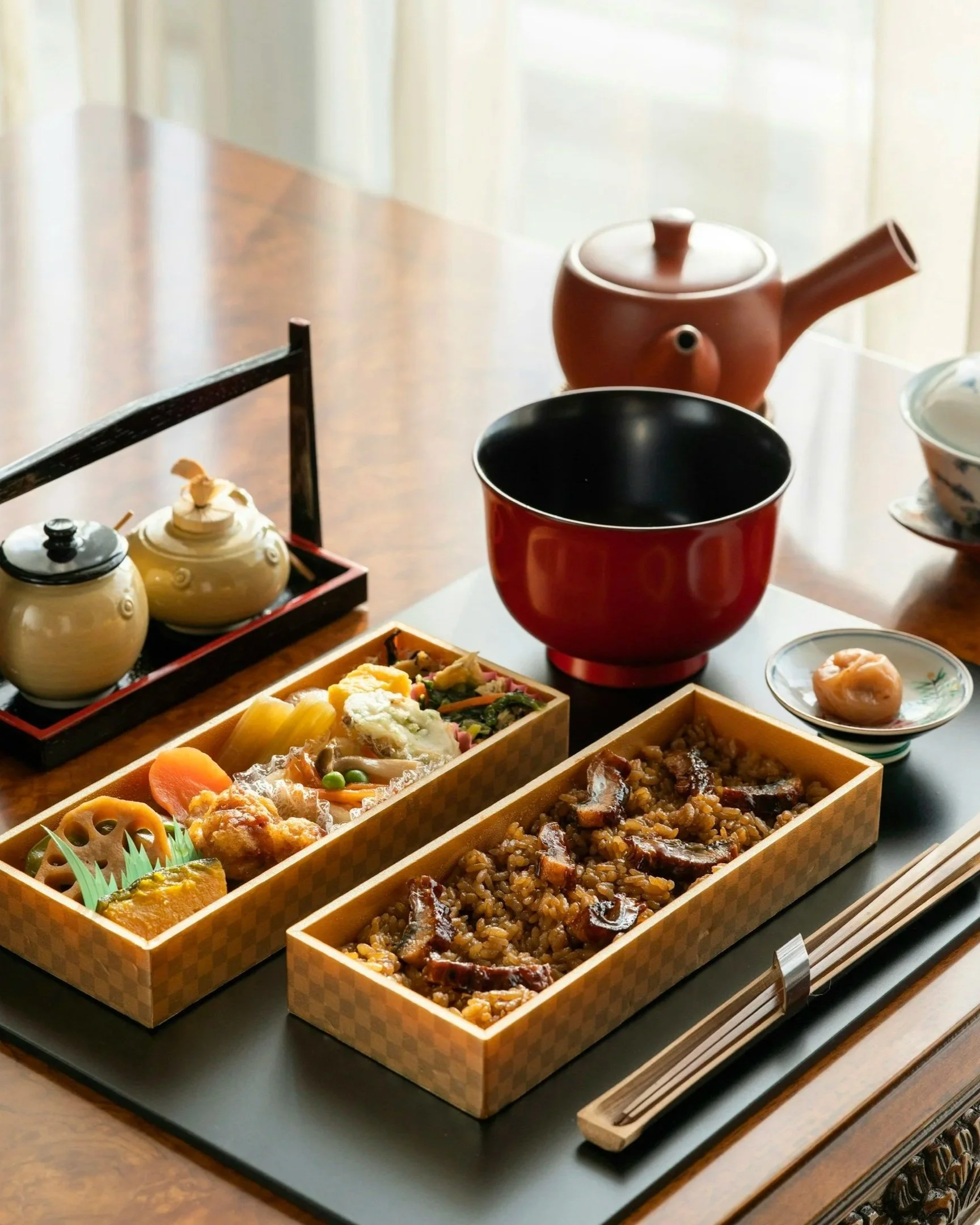 Autumnal vegetables (Lotus, Carrot, Cabbage, Edamame), Eel, Rice, Plum